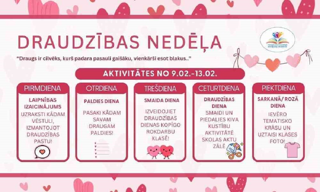 No šī gada 9.02.-13.02. skolā norisinājās sirsnīga un pozitīvām emocijām bagāta Draudzības nedēļa, kuras laikā skolēni piedalījās dažādās aktivitātēs, kas veicināja saliedētību, savstarpējo cieņu un labestību.