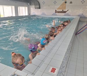 Maija nogalē Daugavpils Draudzīgā aicinājuma vidusskolas (Raipoles iela 8) audzēkņiem bija iespēja apmeklēt skolas mazo baseinu, lai piedalītos peldētapmācības nodarbībās, kuras vadīja sporta skolotājs S. Kiseļovs. Pirms baseina apmeklējuma pirmsskolas izglītības skolotājas bērnus iepazīstināja ar drošības noteikumiem un iesaistīja izziņas darbībā, kā rezultātā tapa kopdarba plakāts par tēmu “Baseins”. Iepriekš iegūtā informācija palīdzēja pirmsskolniekiem sagatavoties peldbaseina apmeklējumam. Sporta skolotājs bērniem sniedza norādījumus un apmācīja, kā pareizāk apgūt roku un kāju kustības ūdenī.