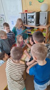 Mūzikas nodarbības laikā pie bērniem ieradās arī lielākais medus kārumnieks – Lācis, kurš ar prieku piedalījās ar bērniem dažādās rotaļās. Pastaigas laikā vēroja ziedus un mēģināja tajos sameklēt rosīgas bites. Pētīja kukaiņu mājas un skanēja OR kodus, aiz kuriem slēpjas informācija par teritorija mītošajiem kukaiņiem, arī bitēm.