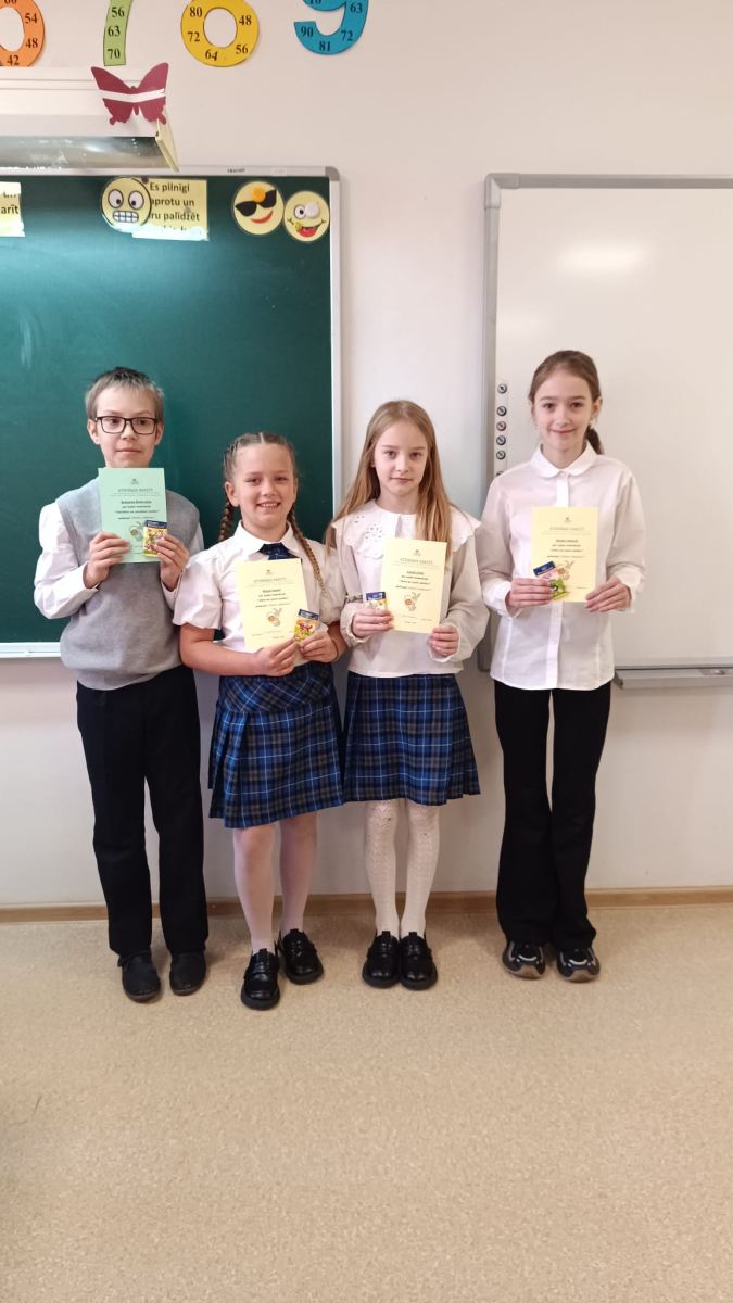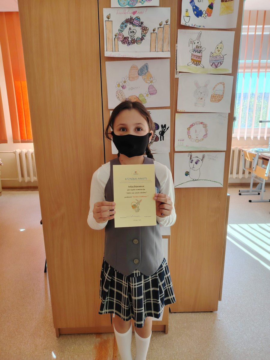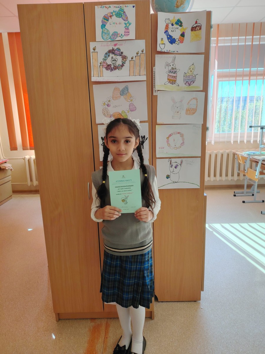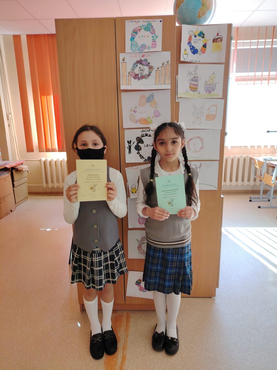 Pasākuma “Izkrāso Lieldienas!” rezultāti: nominācijā “Aktīvākā klase” uzvarēja 2.a klase, savukārt nominācijā “Zinošā klase” uzvaru izcīnīja 3.b klase. Aktīvākie uz zinošākie skolēni – R.Borkovskis (3.b), A.Karluša-Dominguša (2.a), S.Bojaruneca (2.a), V.Jakovļeva (3.a), D.Ustinova (3.b), M.Jonāne (3.b), A.Stole (3.b) – saņēma atzinības rakstus un nelielu saldu balvu.