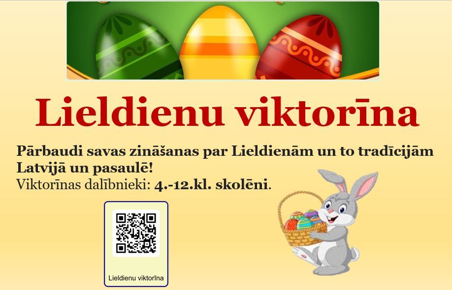 Savukārt 4. -12. klašu skolēniem bija organizēta tiešsaistes “Lieldienu viktorīna”, kurā bija jāatbild uz jautājumiem par Lieldienu nozīmi, simboliem un tradīcijām Latvijā un pasaulē. Nominācijā “Aktīvākā klase” uzvarēja 6.a klase. Nominācijā “Zinošākā klase” atzinības rakstus saņēma 5.b, 9.e un 11.d klase. Nominācijā “Zinošākais skolēns” atzinības rakstus saņēma: M.Solovjovs (6.b), S.Poļetajeva (10.a), A.Vanagele (12.a), E.Cauņa (7.b), E.Ņukša (11.d), A.Harune (12.a), M.Sergejevs (12.d), E.Pavlovska (4.b), A.Fomina (5.b.), S.Cakulova (5.b), I.Rodčenko (7.b), D.Siļčonoka (7.b), M.Stankevičs (8.a).