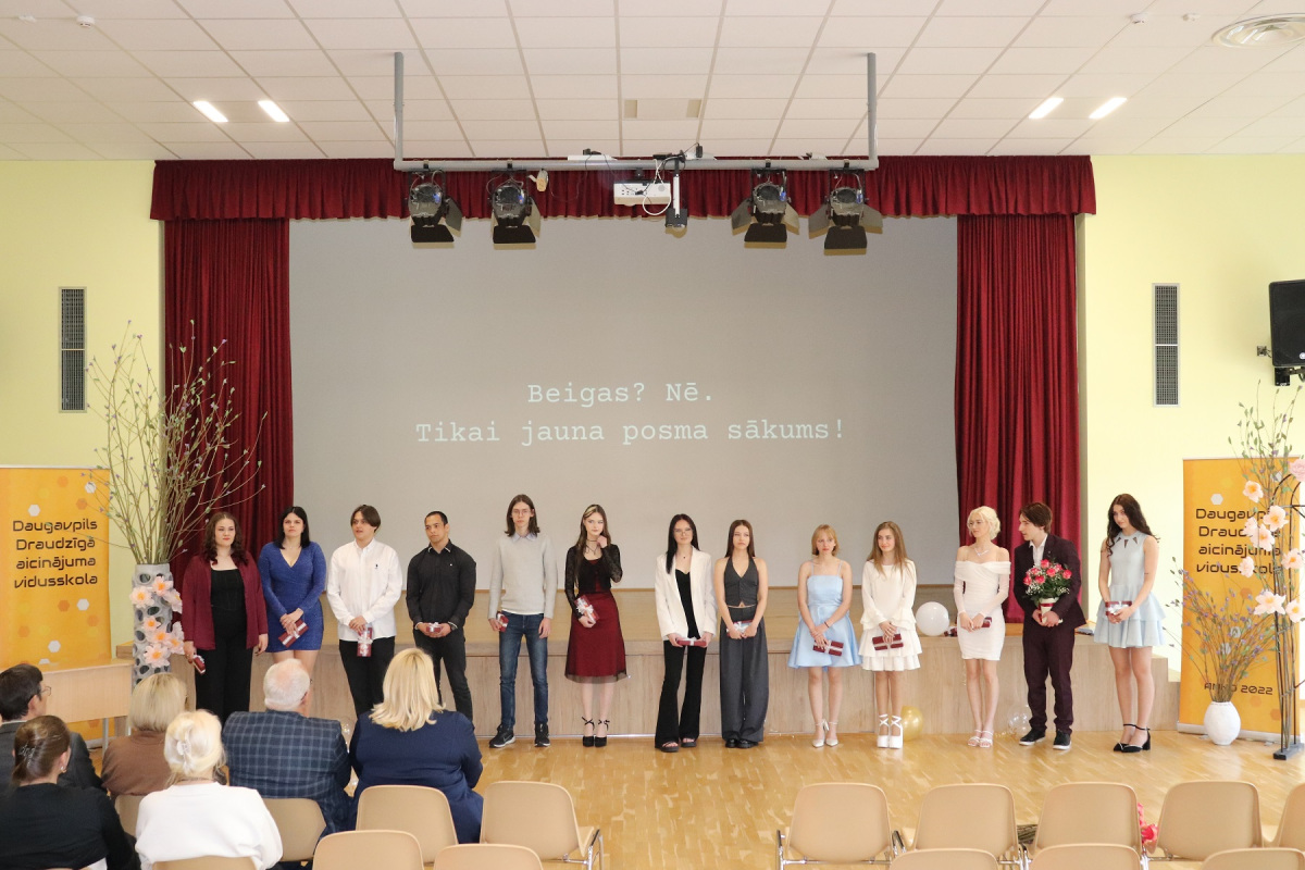 Ar labiem novēlējumiem absolventus un pasākuma viesus uzrunāja Daugavpils Draudzīgā aicinājuma vidusskolas direktore Kristīna Ivancova. Sirsnīgus vārdus saviem audzināmajiem teica 12.d klašu audzinātāja Oksana Staņeviča. Prezentējot skolas fotogrāfijas, visi kopā atcerējās vidusskolas spilgtākos momentus. Burvīgu noskaņojumu rādīja vokālā ansambļa priekšnesumi. Skolēni saņēma daudz sirsnīgu novēlējumu turpmākajam dzīves ceļam, kas viņiem šobrīd ir ļoti nepieciešams – tālāk būs eksāmeni, jaunas tikšanās, atklājumi, jaunā un lielā dzīve.