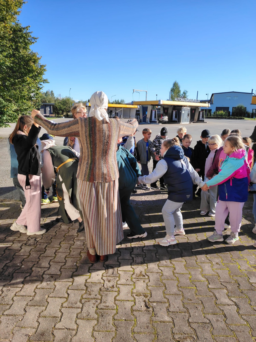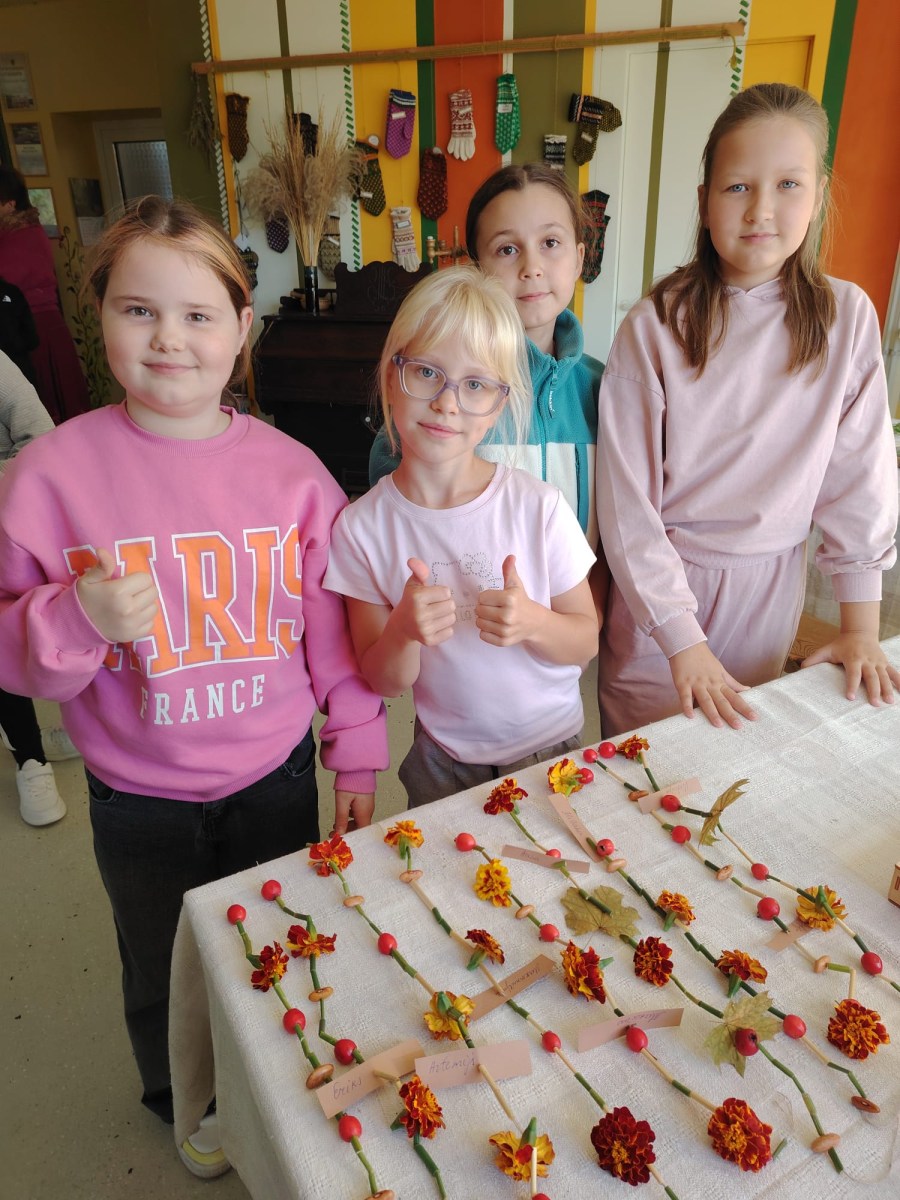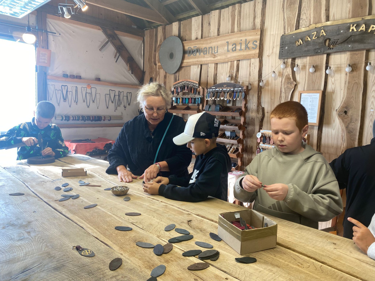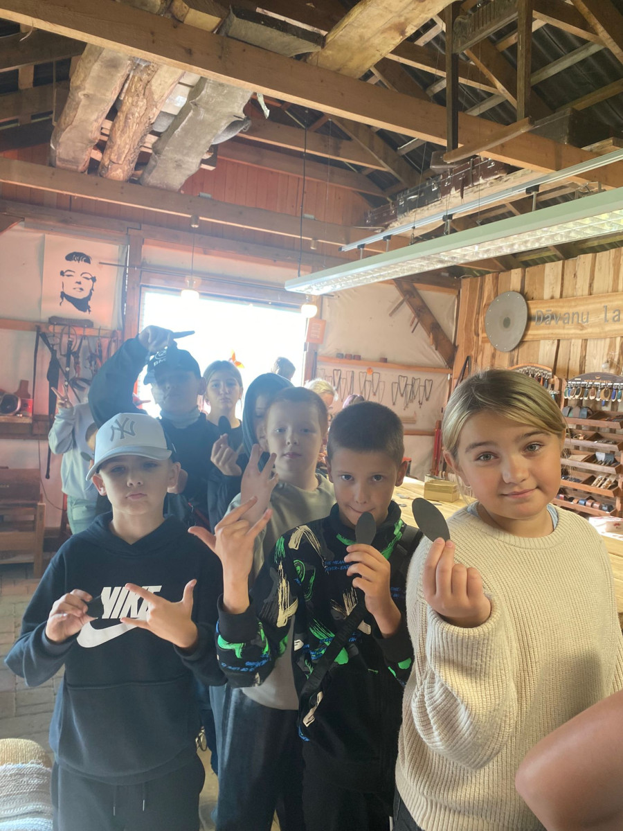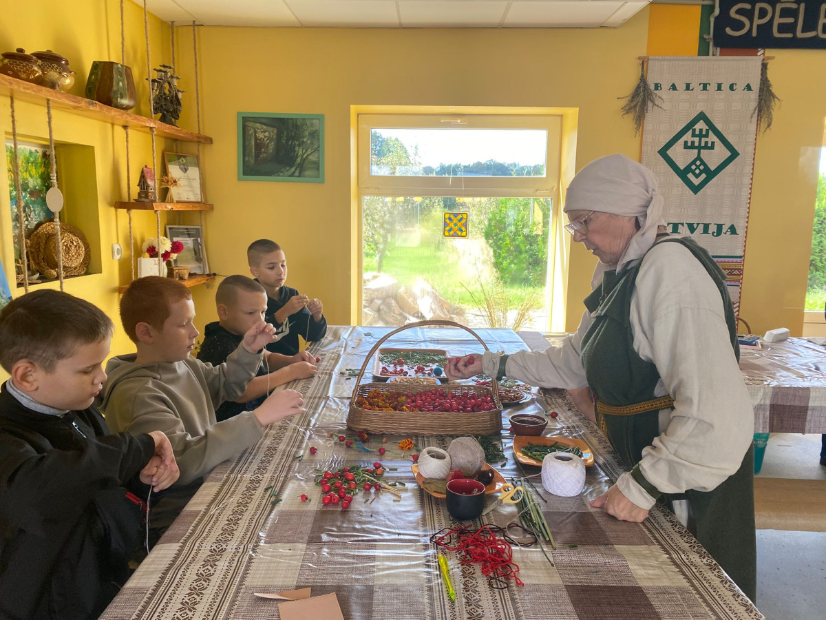 Pēc tam mēs devāmies uz biedrības “Baltaine” Radošu māju, kas aicināja piedalīties rotaļu, danču un spēļu programmās, amatnieku darbnīcās un kulinārā mantojuma meistarklasēs. Skolēni gan cepa pīrādziņus, gan veidoja savu augļu tēju, gan gleznoja ar gludekli, gan veidoja virtenītes no dabas veltēm. Programma bija ļoti plaša un skolēniem patika.