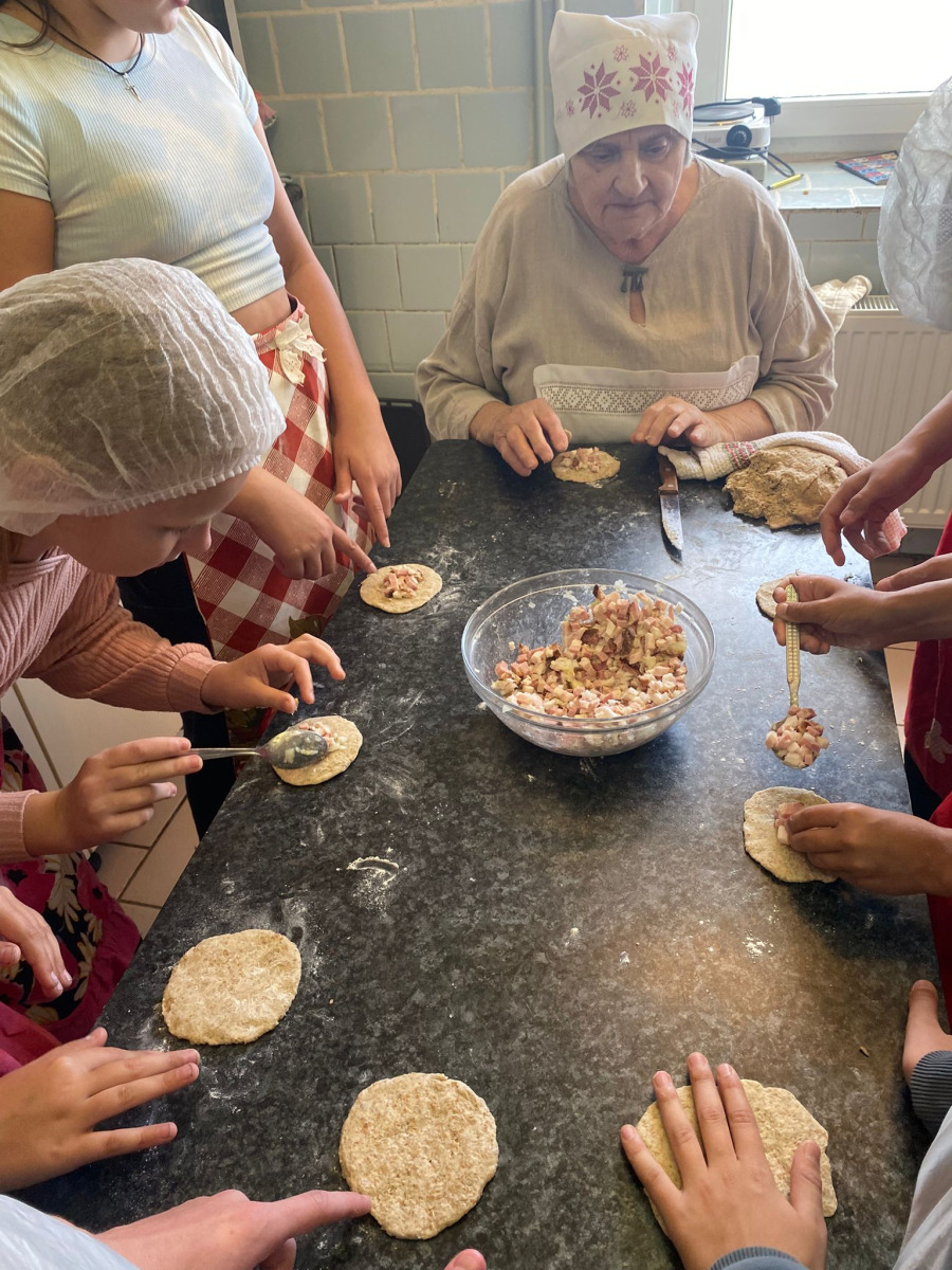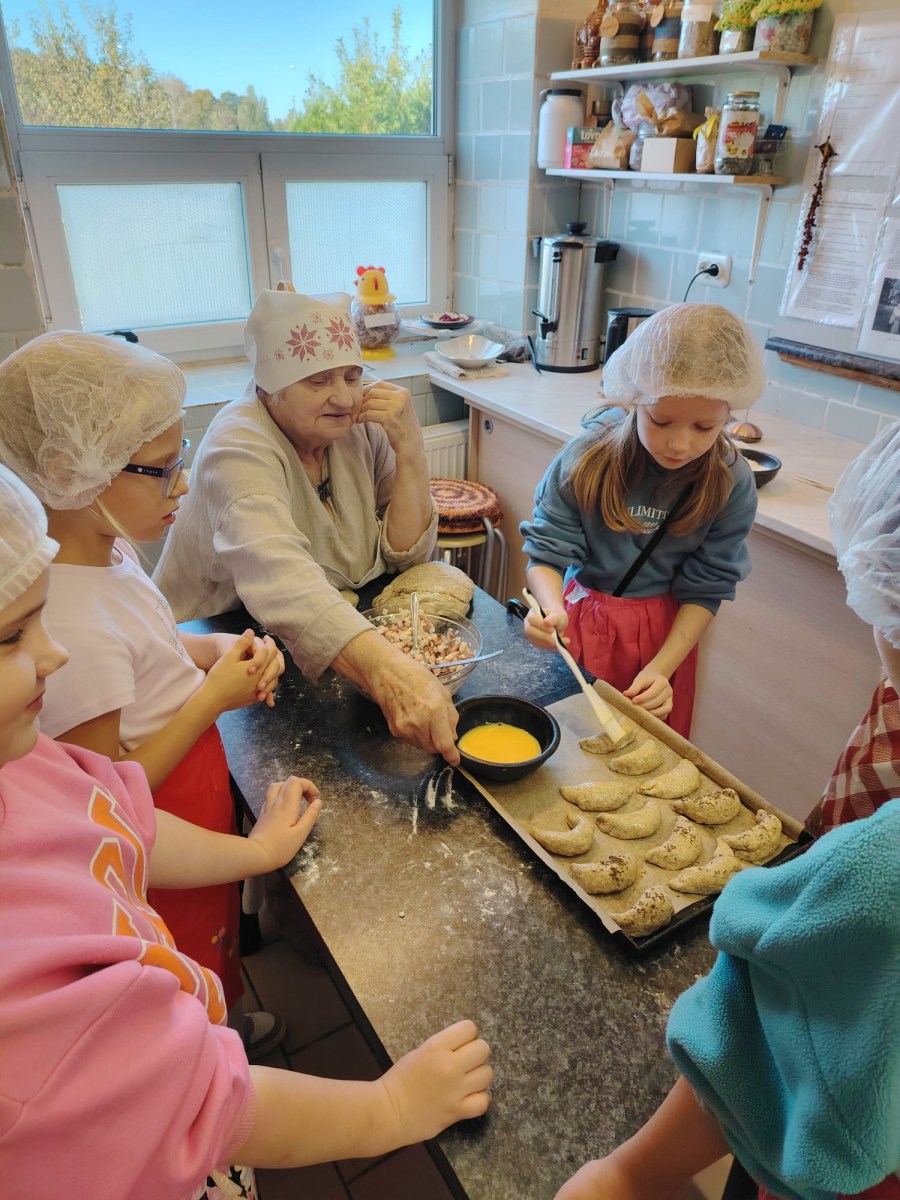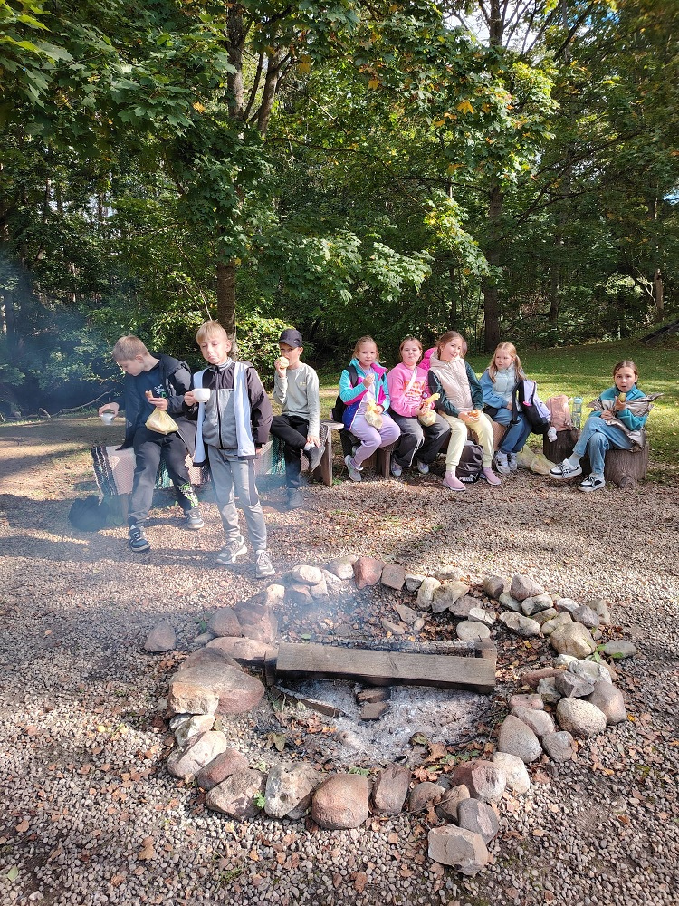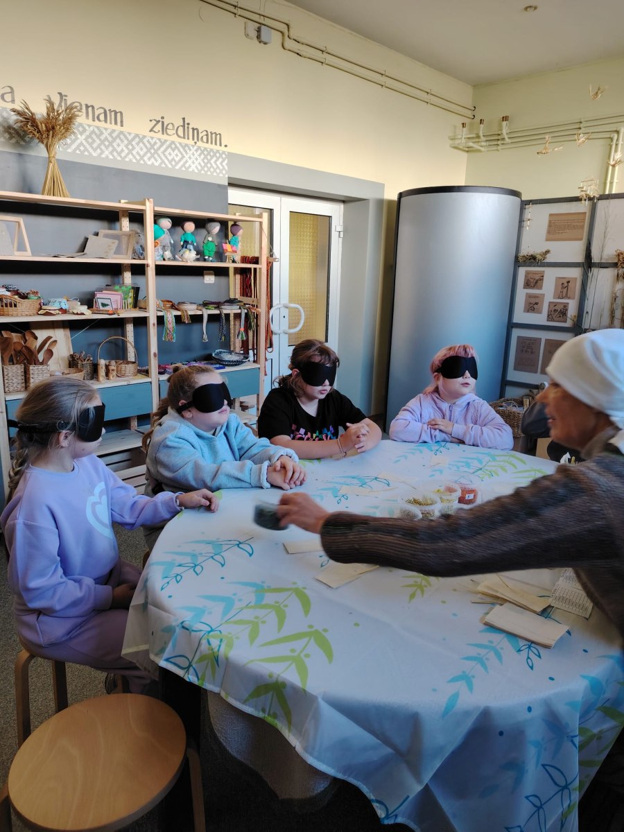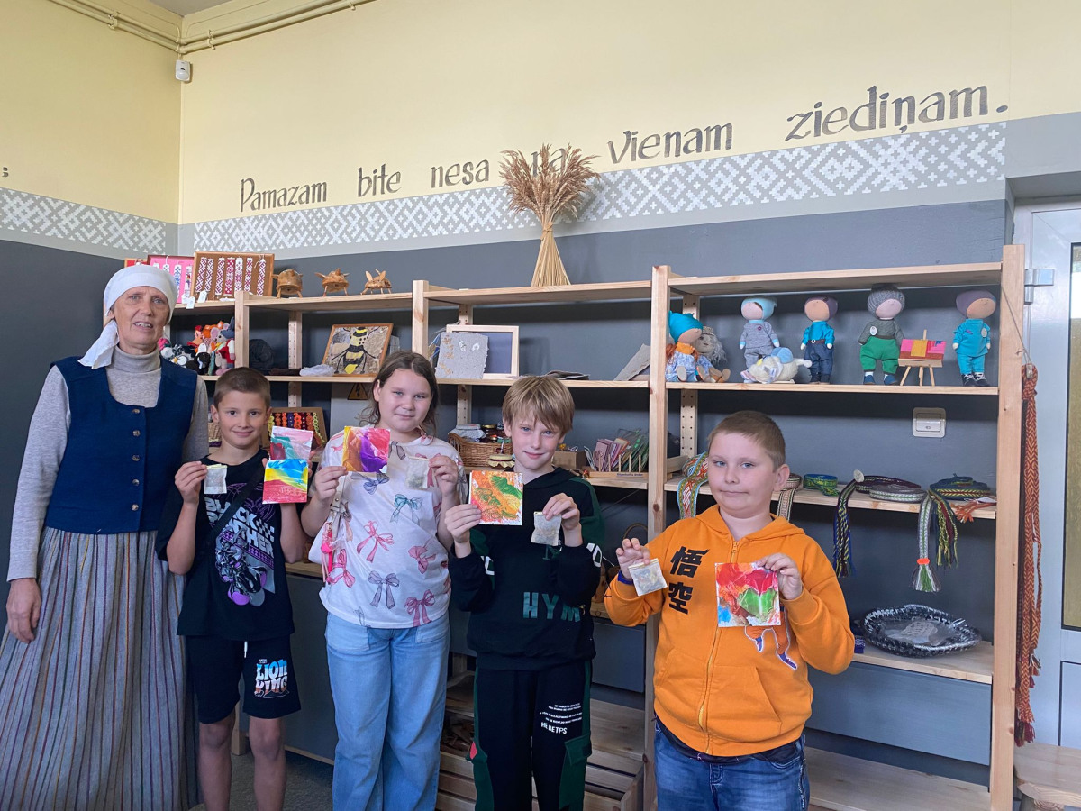 Pēc tam mēs devāmies uz biedrības “Baltaine” Radošu māju, kas aicināja piedalīties rotaļu, danču un spēļu programmās, amatnieku darbnīcās un kulinārā mantojuma meistarklasēs. Skolēni gan cepa pīrādziņus, gan veidoja savu augļu tēju, gan gleznoja ar gludekli, gan veidoja virtenītes no dabas veltēm. Programma bija ļoti plaša un skolēniem patika.