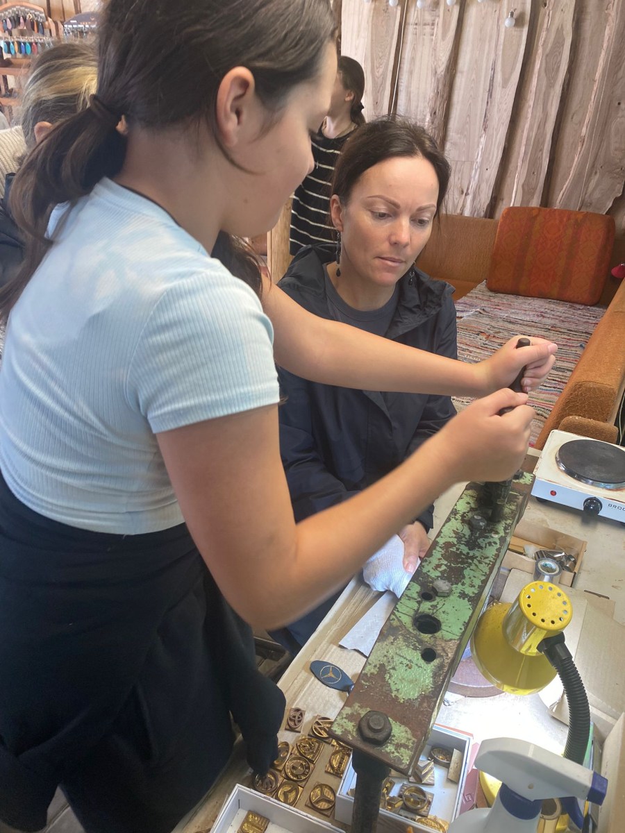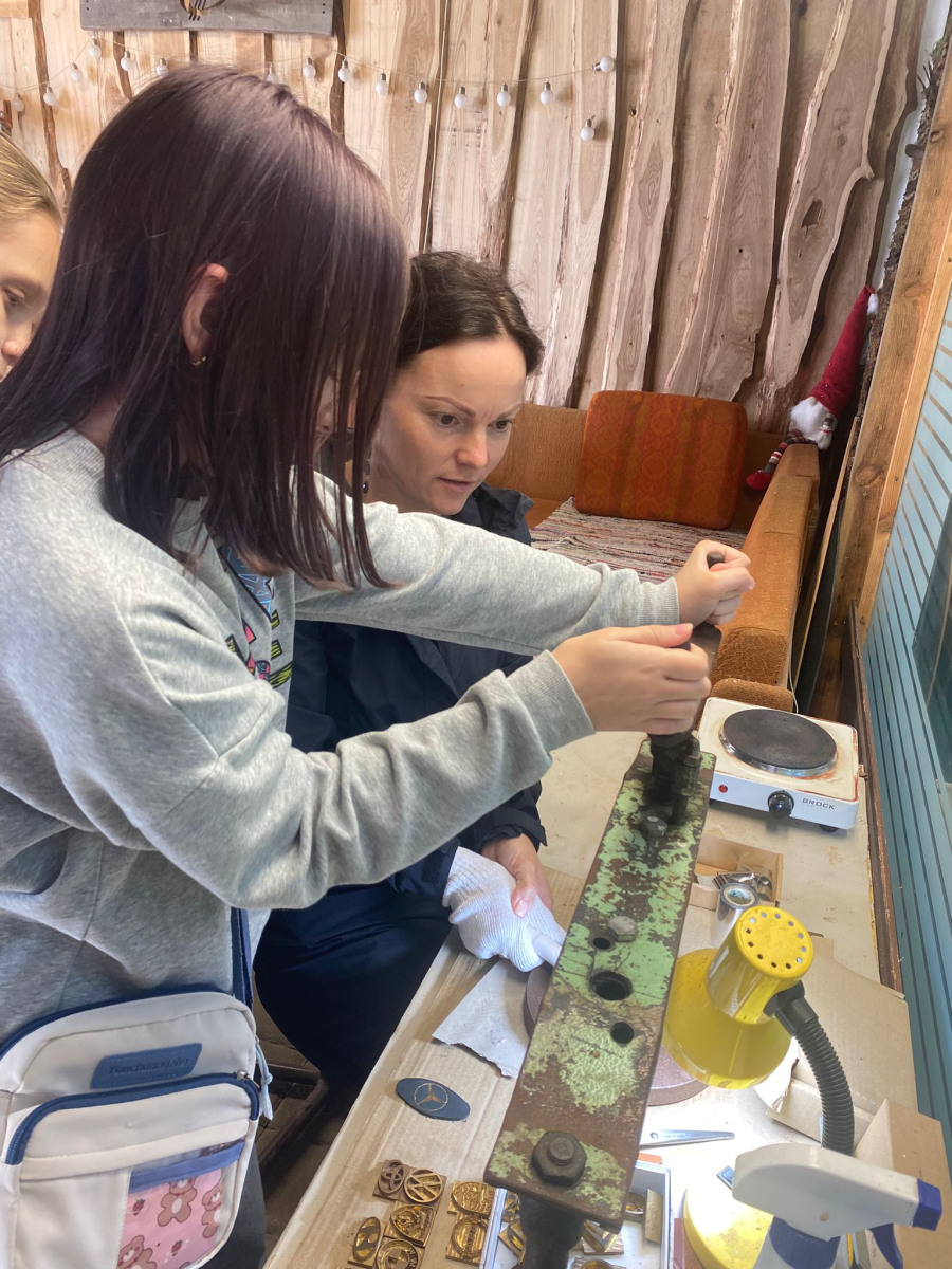 Ceļojums sākās ar ādas dizaina centra “Dunense” apmeklējumu. Ādas aksesuāru darbnīcā skolēni nokļuva radošā mākslas gaisotnē. Ieejot darbnīcā, viņi sajuta krāsu, līmes un ādas smaržu, vēroja, kā strādā ādas amatnieki. Visi tika iepazīstināti ar dažādajiem ādu veidiem, mūsdienu un antīkajiem instrumentiem, ar kuriem strādāja. “Dunense” turpina senās ādas apstrādātāja aroda tradīcijas, uzkrātās zināšanas par šo amatu nododot nākamajām paaudzēm. Mūsu skolēni, piedaloties radošajās aktivitātēs, kopā ar meistariem aktīvi līdzdarbojās ādas izstrādājuma tapšanā, iemācījās atšķirt, piemēram, dažādas ādas (bifeļa, čūskāda, lāčāda u.c.), iejutās amatnieka lomā, līdzņemšanai izgatavoja unikālu suvenīru – atslēgas piekariņu.