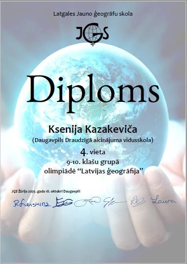 Mūsu skolu olimpiādē pārstāvēja 14 skolēni, kuri ar aizrautību un zinātkāri risināja dažādus uzdevumus par Latvijas dabu, pilsētām un reģioniem. Īpašs prieks par skolēniem, kas savā vecuma grupās parādīja lieliskus rezultātus: Gļebs Mihailovs (9.b) – 3. vieta, Ksenija Kazakeviča (10.a) – 4.vieta.
