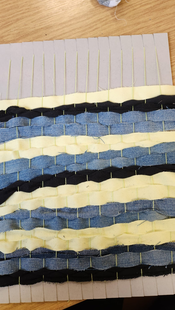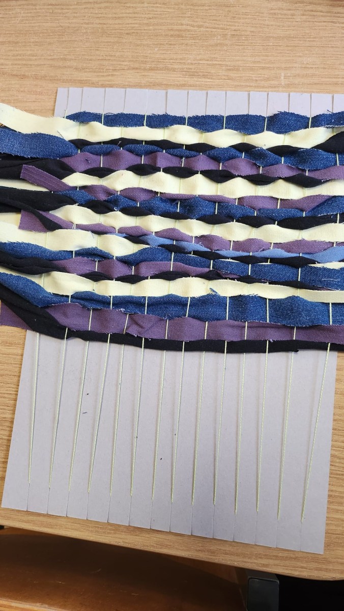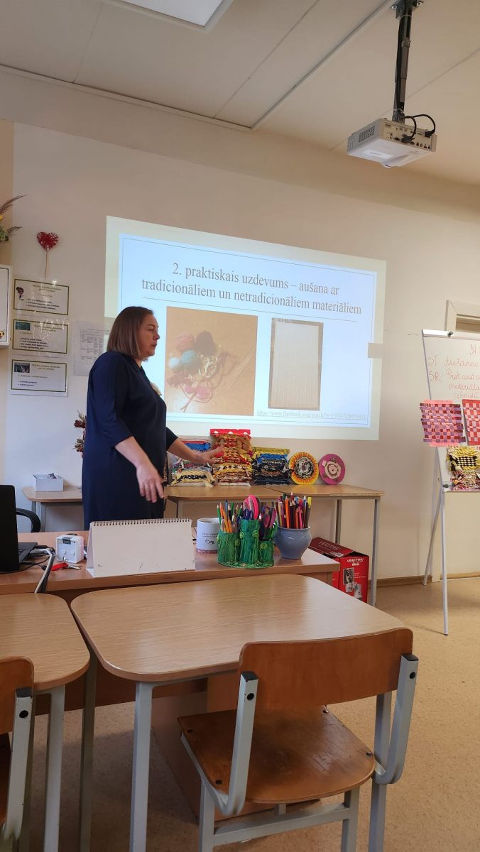 Lielajā starpbrīdī vecāki apmeklēja izstādi “Par ilgtspējīgu Latviju jeb džinsu otrā dzīve” un aplūkoja gobelēnus, ko 7. klašu skolēni kopā ar skolotāju Daci Soikāni bija izveidojuši no pārstrādātiem materiāliem, īpaši izmantojot vecos džinsus.