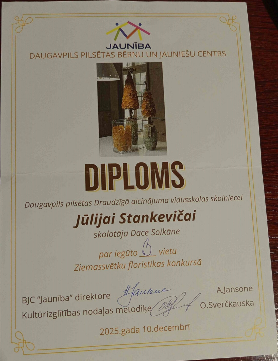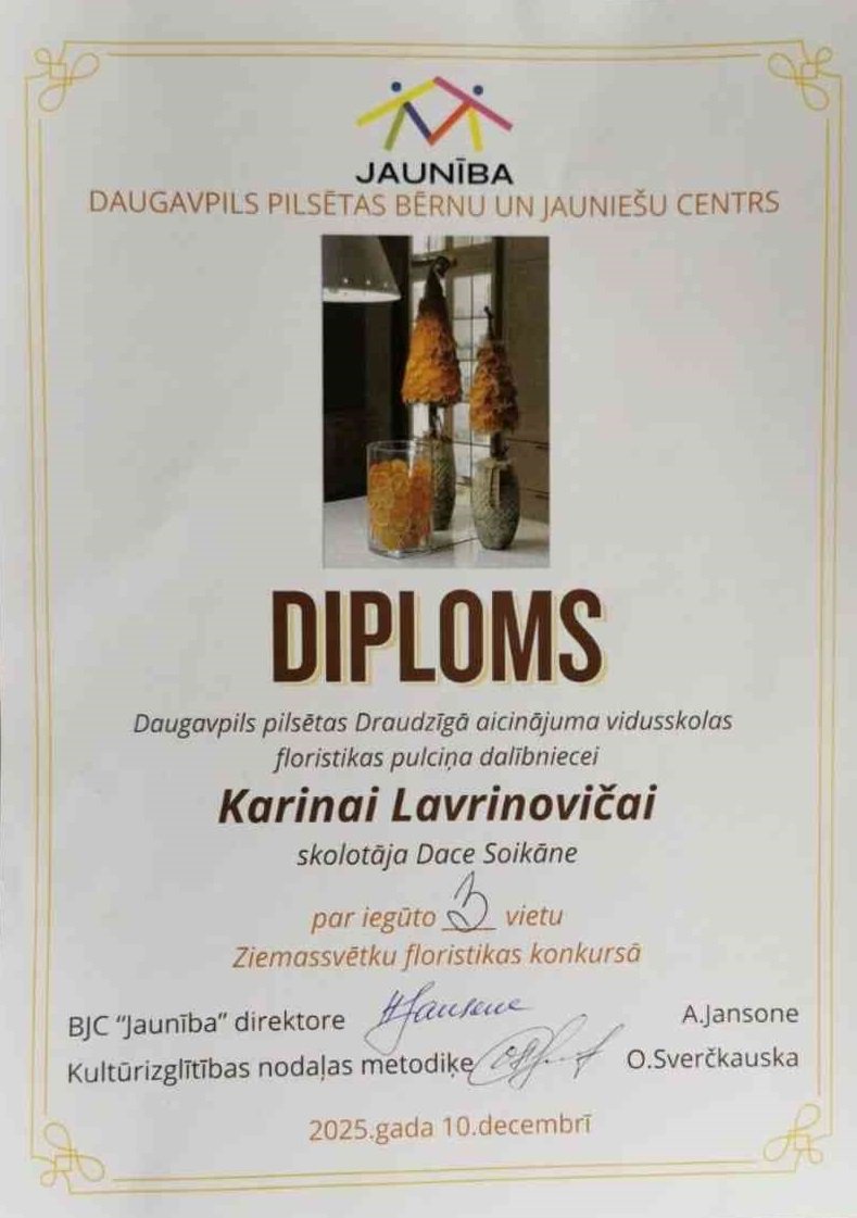 Šī gada 10.decembrī Daugavpils Draudzīgā aicinājuma vidusskolas skolēni piedalījās Bērnu un jauniešu centra “Jaunība” organizētajā Ziemassvētku floristikas konkursā “Egles rota – egle”. Konkursa mērķis bija popularizēt floristikas interešu izglītības programmas, piedāvāt iespēju izglītības iestāžu skolēniem un floristikas interešu izglītības programmu dalībniekiem parādīt savas zināšanas, prasmes un iemaņas konkursā.