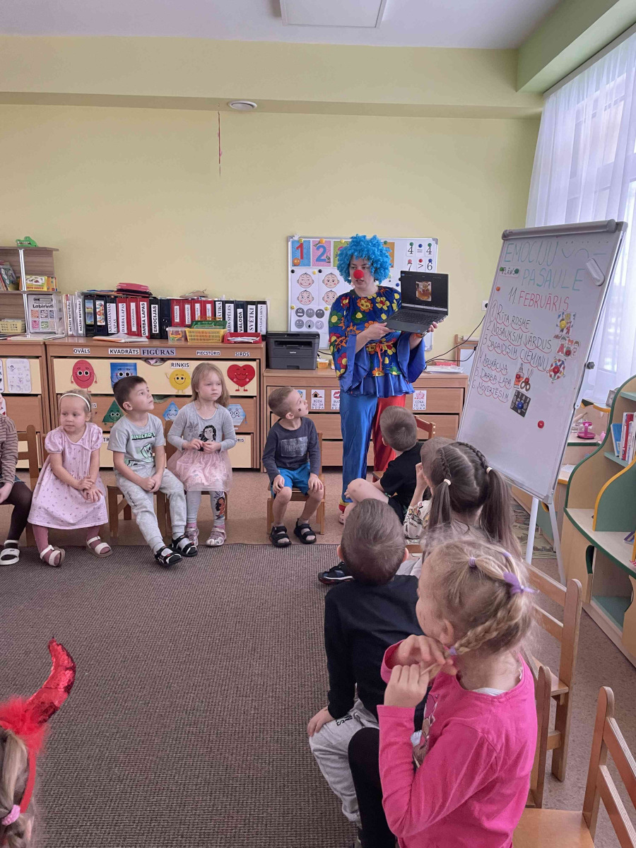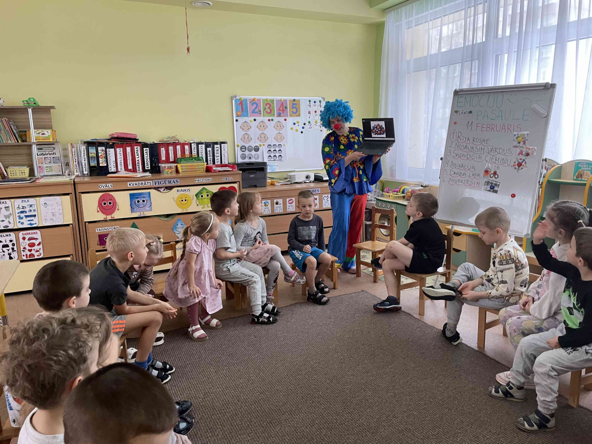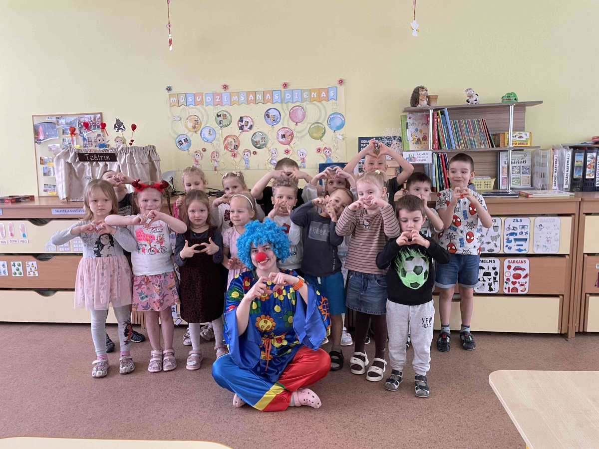 Pie bērniem viesojās jautrais un atraktīvais Klauns, kurš, darbojoties kopā ar viņiem, radīja tiem patiesi spilgtus un neaizmirstamus mirkļus. Rotaļnodarbības laikā bērni piedalījās daudzveidīgās aktivitātēs. Kopā ar Klaunu veica mazus burvju trikus, atbildēja uz dažādiem jautājumiem un mācījās atpazīt emocijas. Noslēgumā, darbojoties radoši, bērni izveidoja krāsainus aplikācijas darbus “Jautrais Klauns”. Smiekli, pārsteigums, prieks un sajūsma – emociju bija daudz un dažādas! Tieši to arī vēlējāmies – lai bērni caur piedzīvojumu un rotaļu vēl dziļāk iepazītu emociju pasauli.