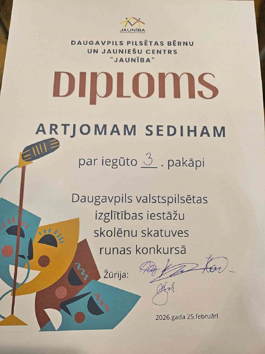 Dalībnieki runāja vienu prozas un vienu dzejas darbu. Žūrija vērtēja runas saturu, izteiksmes skaidrību, emocionalitāti un skatuves kultūru. Mūsu skolas 4. d klases skolēns Artjoms Sedihs piedalījās konkursā un ieguva 3. pakāpes diplomu. Artjoms deklamēja J. Osmaņa dzejoli “Draugi” un I. Ziedoņa prozas fragmentu “Skaistums”.