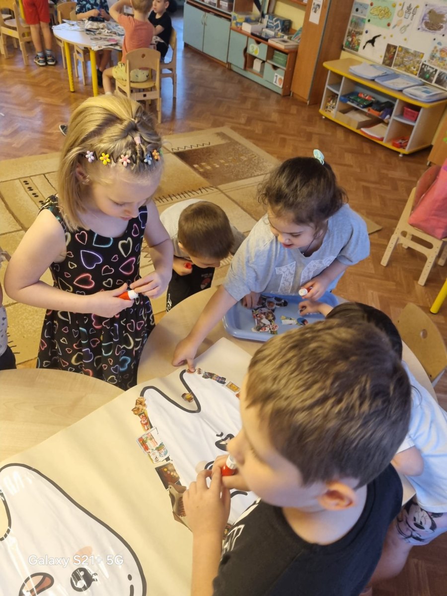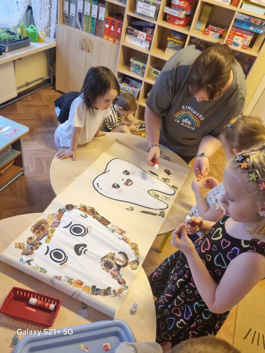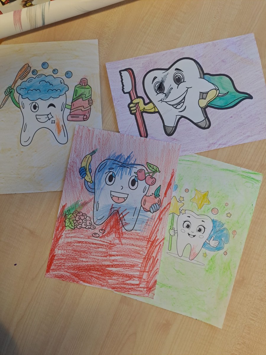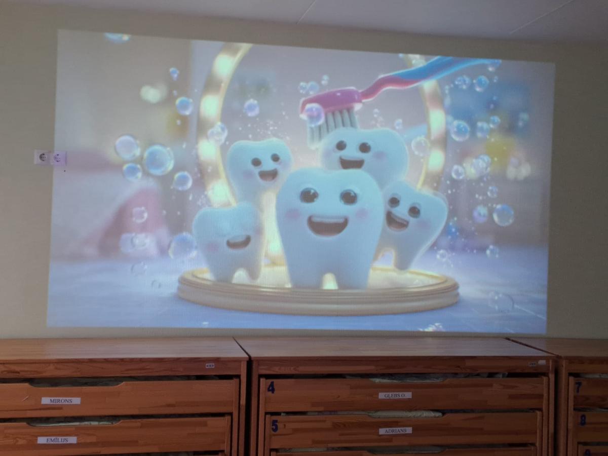 Arī Stāvā ielas speciālo grupu “Bitīte” un “Gliemezītis” bērni šajā dienā piedalījās izzinošās un radošās aktivitātēs. Dienas sākumā bērni skatījās izglītojošu prezentāciju un animācijas filmiņu par zobu kopšanu, kurā saprotamā un saistošā veidā tika skaidrots, kā pareizi tīrīt zobus un kādi ieradumi palīdz saglabāt tos veselus. Turpinājumā radošajā darbībā bērni strādāja ar avīžu materiāliem – meklēja, izgrieza un šķiroja attēlus, kas atspoguļo zobiem labvēlīgus un nelabvēlīgus produktus un ieradumus. No šiem materiāliem tapa kopīgs plakāts, kas kalpo kā vizuāls atgādinājums par veselīga dzīvesveida nozīmi. Šīs aktivitātes rosina pārdomas: Kādi ikdienas ieradumi ietekmē mūsu veselību? Cik lielu uzmanību pievēršam profilaksei? Kā varam veidot pozitīvus ieradumus jau bērnībā?