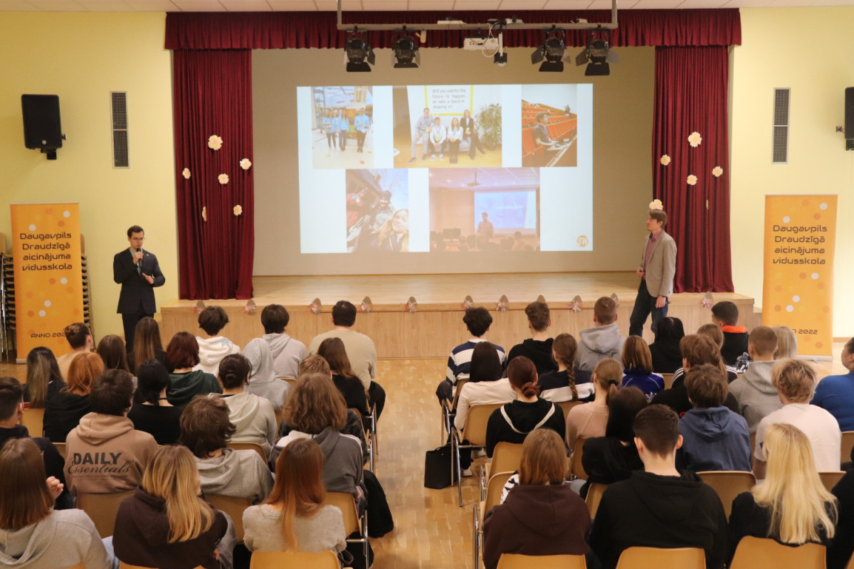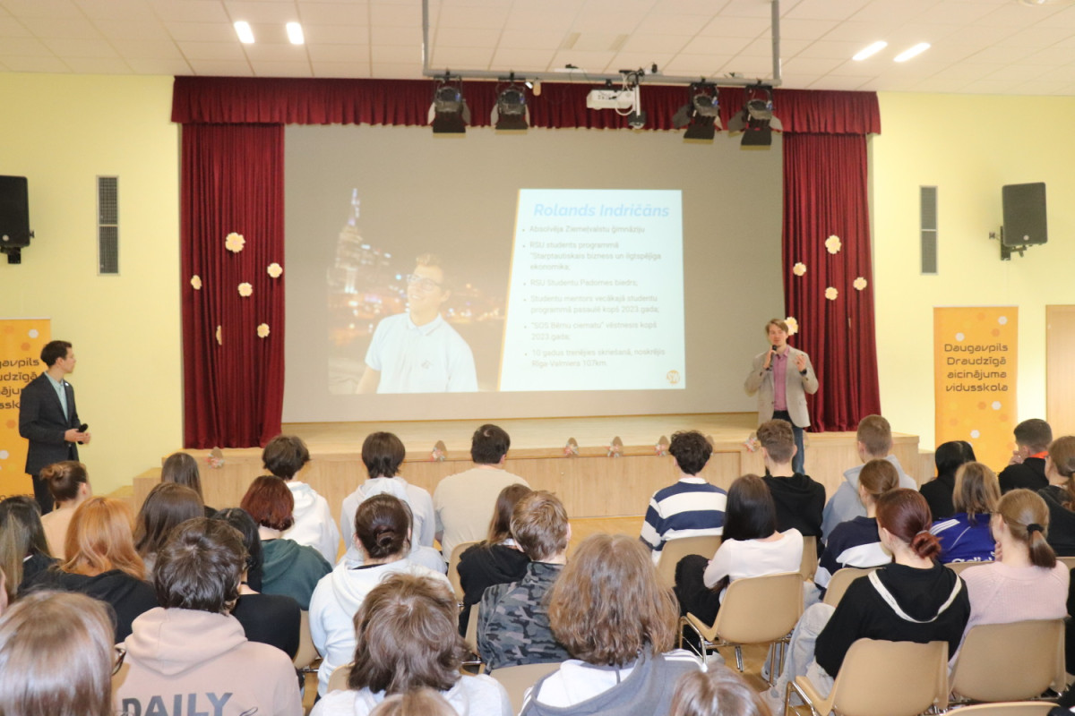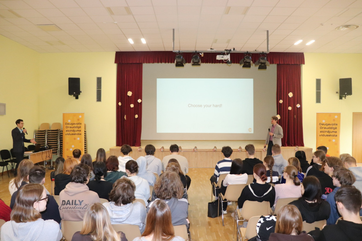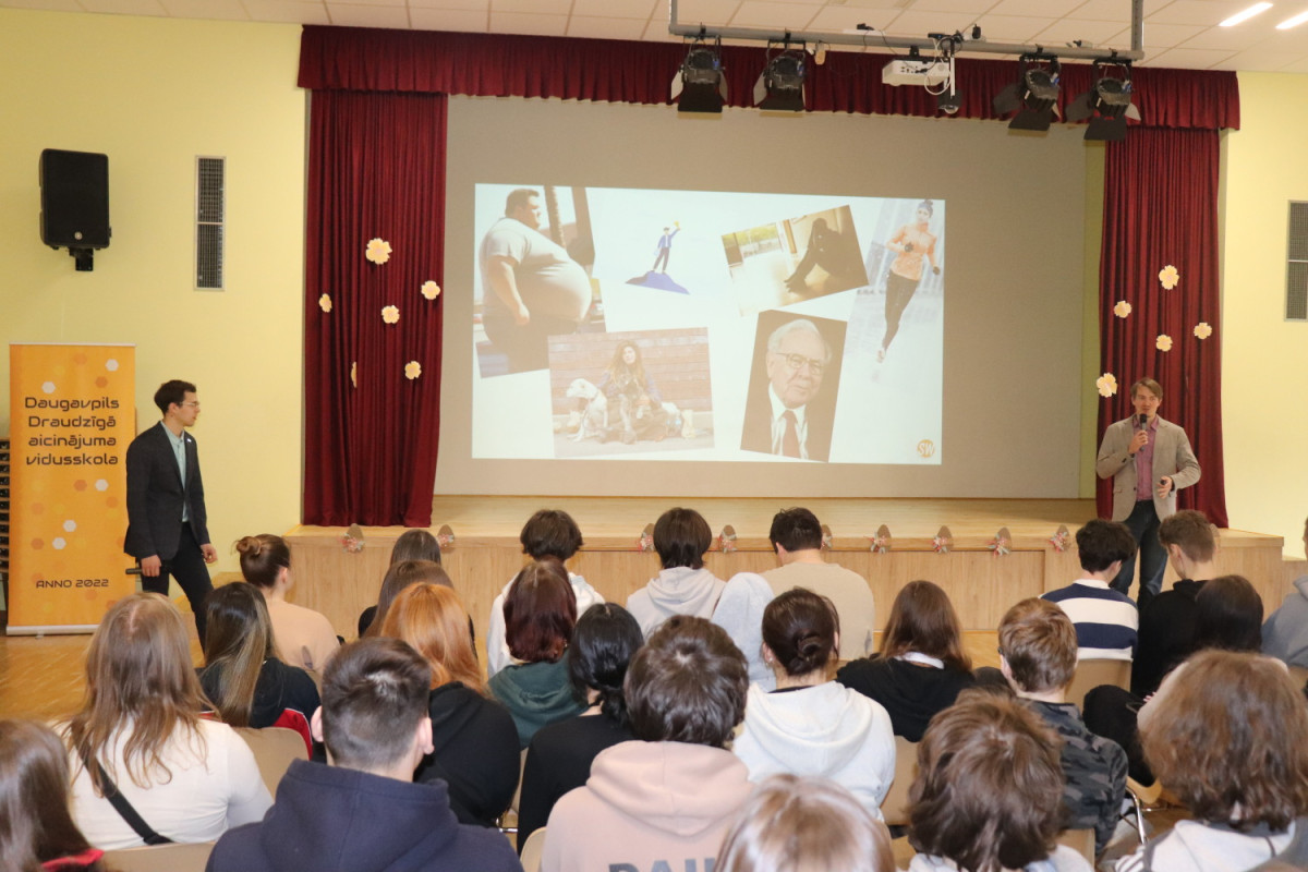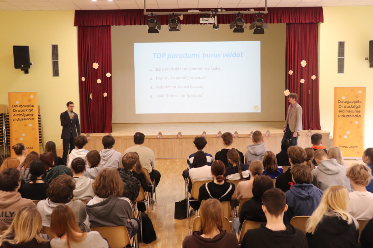 10.-12.klases skolēniem bija iespēja dzirdēt motivējošu pieredzes stāstu par karjeras plānošanu, līderību, laika menedžmentu un uzņēmējdarbības prasmēm. Vieslekcijā tika uzsvērts, ka panākumi sākas ar skaidru mērķu izvirzīšanu, pašdisciplīnu un gatavību izkāpt no komforta zonas, attīstot komunikācijas prasmes. Rolands pārsteidza, ka savā dzīvē ir noskrējis visu ceļa posmu no Rīgas līdz Valmierai 14 stundās, bet Mikus ir vairākkārtīgs Latvijas čempions rubika kuba ātrlikšanas sacensībās. Savā stāstījumā viņi dalījās ar to, ka svarīgi ir uzdot sev jautājumu “Kāpēc?” un motivēt sevi rīkoties.