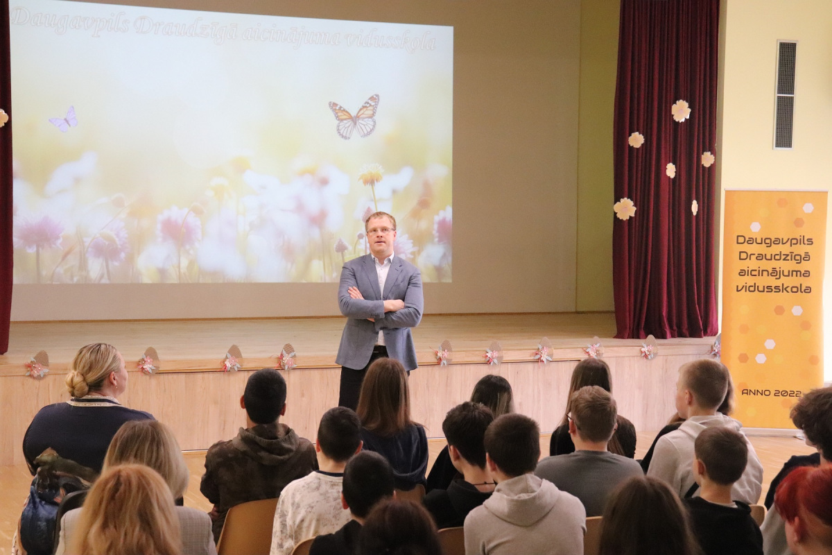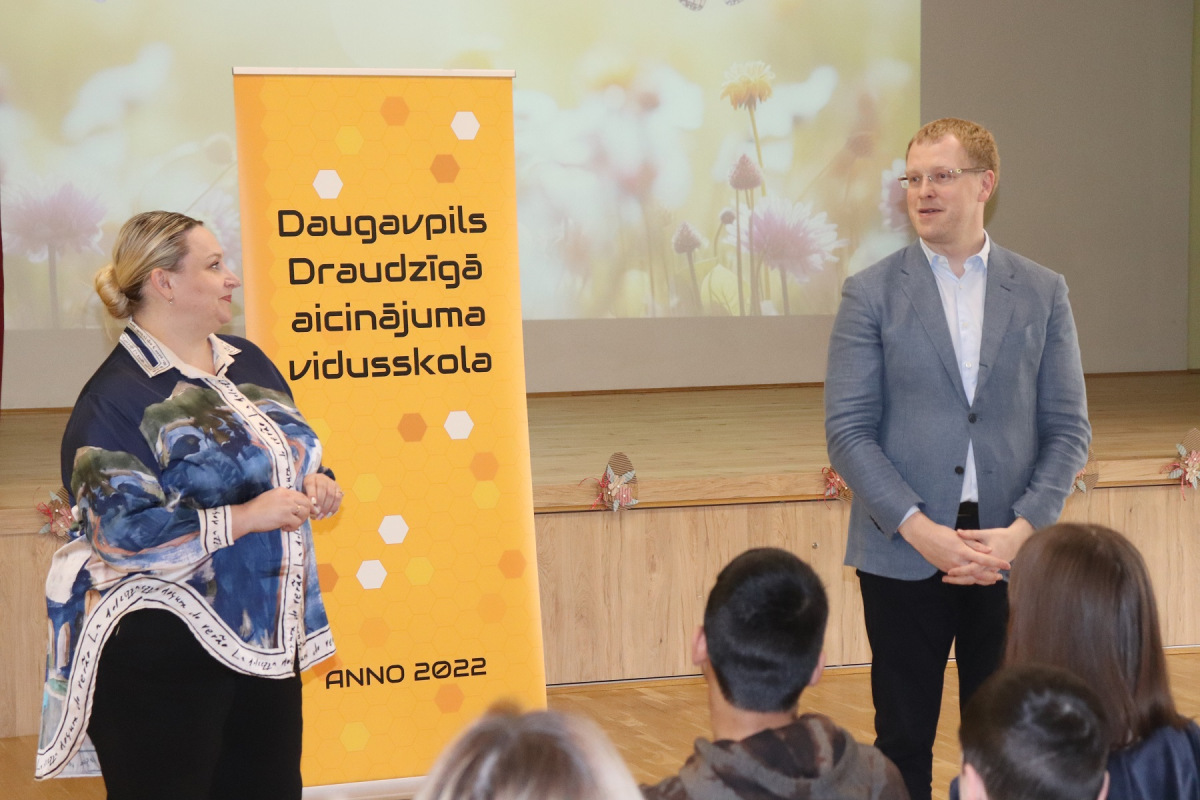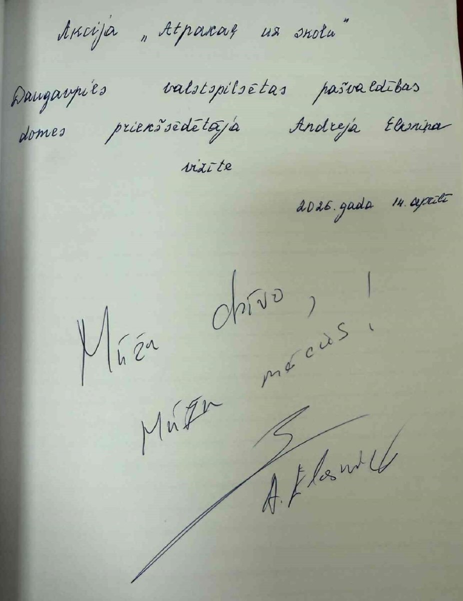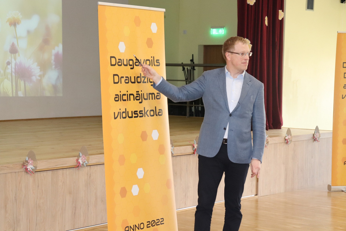 Šī gada 14. aprīlī akcijas “Atpakaļ uz skolu” ietvaros mūsu skolā viesojās Daugavpils valstspilsētas pašvaldības domes priekšsēdētājs Andrejs Elksniņš.