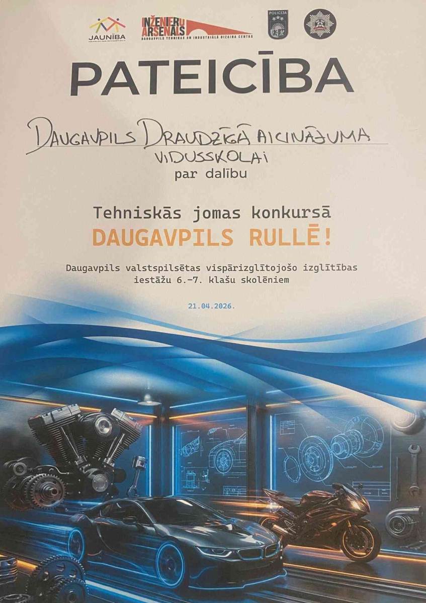 Š.g. 21. aprīlī Daugavpils Tehnikas un industriālā dizaina centrā “Inženieru arsenāls” notika tehniskās jomas konkurss “Daugavpils rullē!” 6.-7. klasēm. Pasākuma mērķis bija veicināt inženiertehnisko prasmju un zināšanu pielietošanu dzīvē, veicot praktiskus un teorētiskus uzdevumus. Konkursu atbalstīja Valsts policija, Valsts ugunsdzēsības un glābšanas dienests, Daugavpils Inovāciju centrs.
