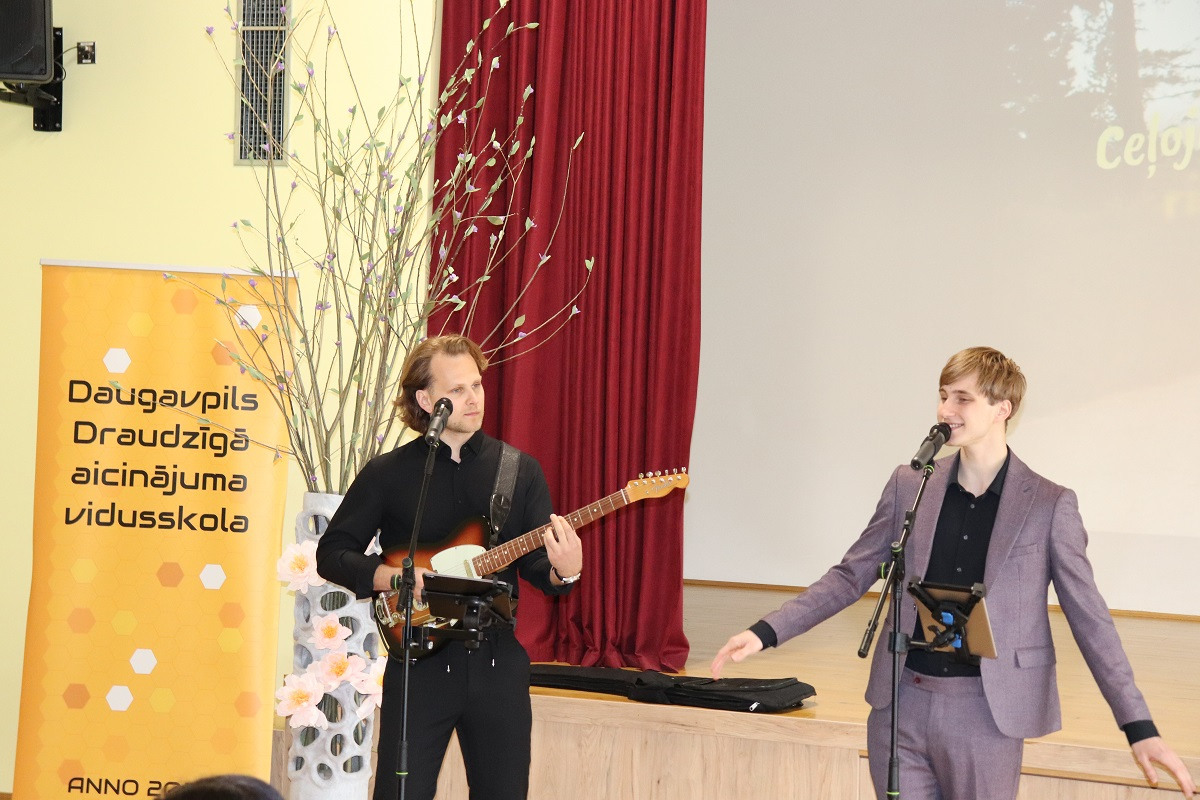 Aizraujošs bija brīdis, kurā mākslinieki aicināja skolēnus uz skatuves un ar zvaniņiem izpildīja dziesmu “Jūs bērniņi nāciet”.